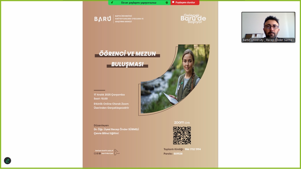 Bölümümüz öğretim üyesi Dr. Öğr. Üyesi Recep Önder Sürmeli tarafından öğrenci mezun buluşması etkinlikleri kapsamında 17 Aralık 2025 tarihinde "Çevre Bilinci" eğitimi verildi. Eğitimde çevre kirliliği, sürdürülebilirlik, doğal kaynakların korunması ve bireysel çevre sorumluluğu konularına değinilerek katılımcılarda çevre farkındalığının artırılması hedeflendi.